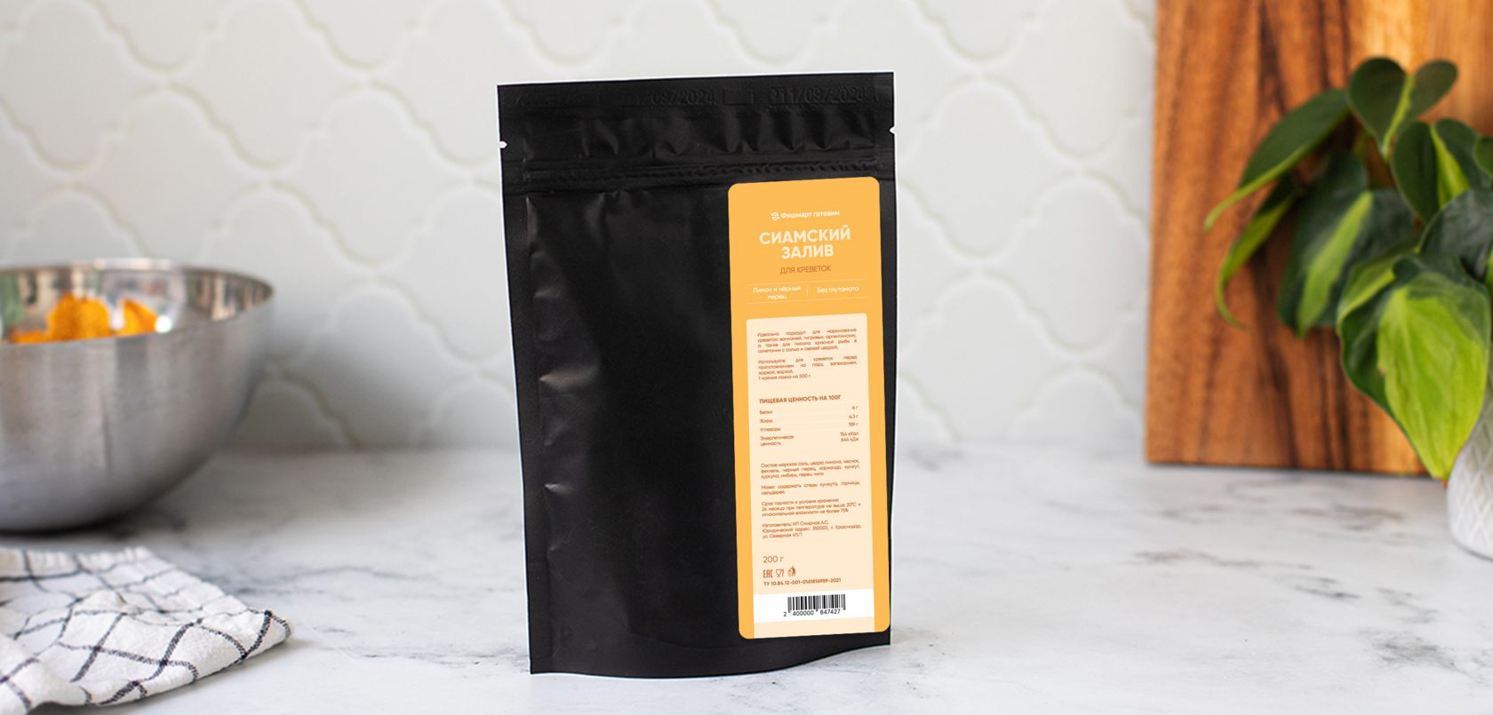 Производитель: ИП Смирнов А.С.,Краснодар по заказу Фишмарт Состав: морская соль, чеснок, кориандр, перец чили, тмин, пажитник, шафран Может содержать следы кунжута, горчицы, сельдерея. Без глутамата натрия Количество в упаковке: 130 г КБЖУ на 100 г: 165ккал / белки - 7.8 г / жиры - 4.7 г / углеводы - 20.4 г Условия хранения: 24 месяца при температуре не выше 20°С и относительной влажности не более 75%.